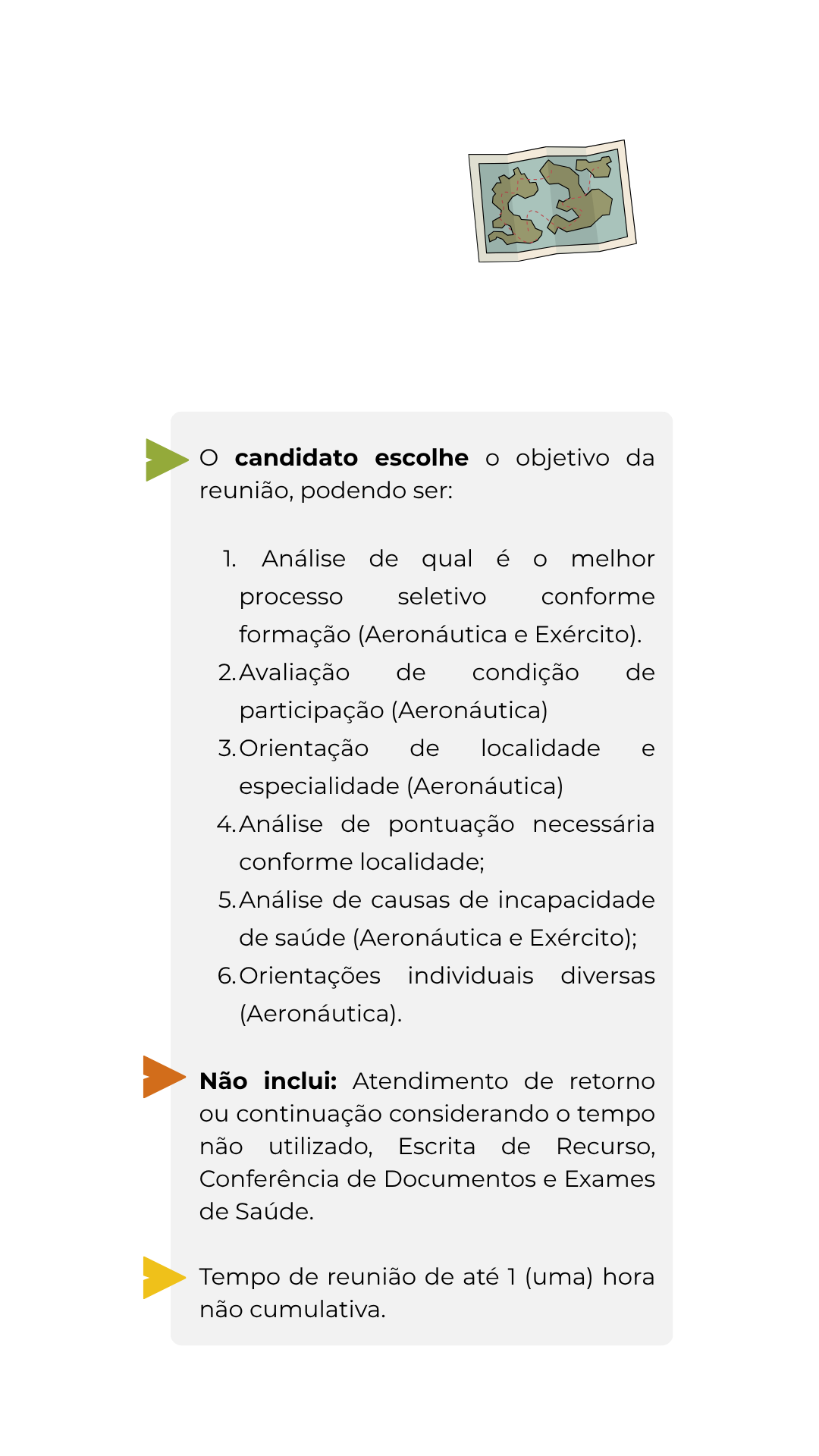 A reunião pode incluir orientações sobre localidade, especialidade e causas de incapacidade de saúde. O candidato tem a oportunidade de tirar dúvidas específicas sobre a sua trajetória, recebendo direcionamento técnico e seguro para tomar as melhores decisões.